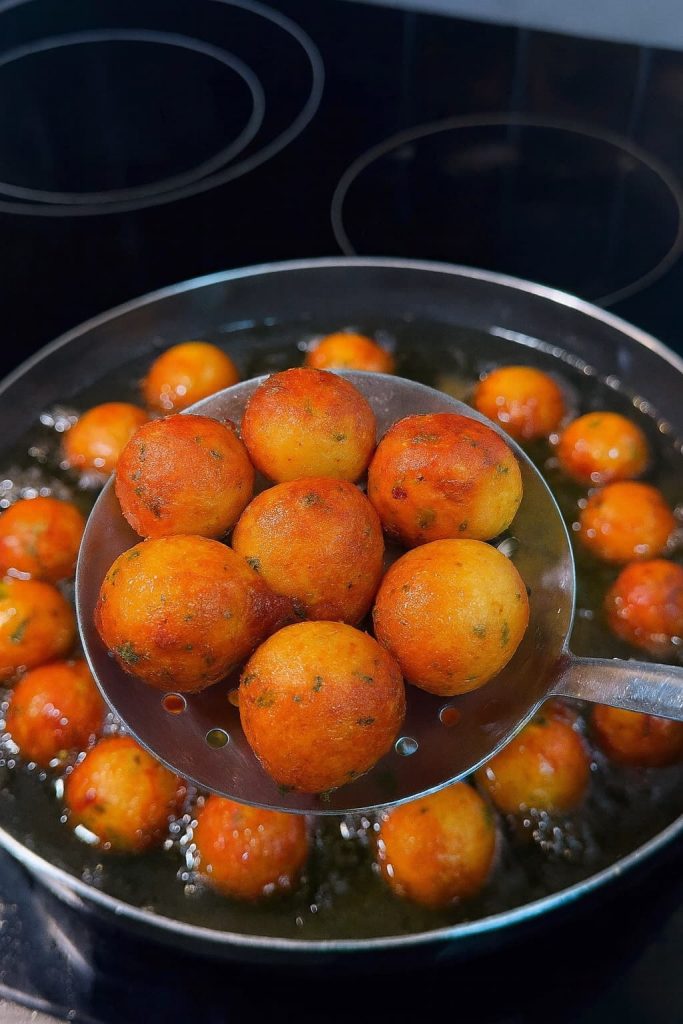 Fríe hasta dorar. Calienta aceite en una sartén profunda y fríe las bolitas por tandas hasta que estén doradas y crujientes por fuera.