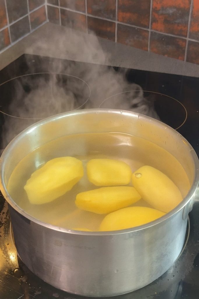 Cuece las patatas. Pela y cocina las patatas en agua con sal hasta que estén tiernas. Escúrrelas bien y déjalas reposar en la olla caliente para que pierdan el exceso de humedad.