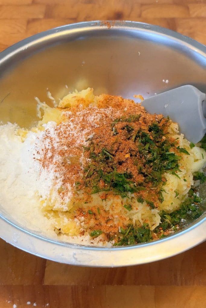 Machaca y condimenta. Haz un puré suave y añade la maicena, las especias y el perejil. Mezcla hasta obtener una masa uniforme.