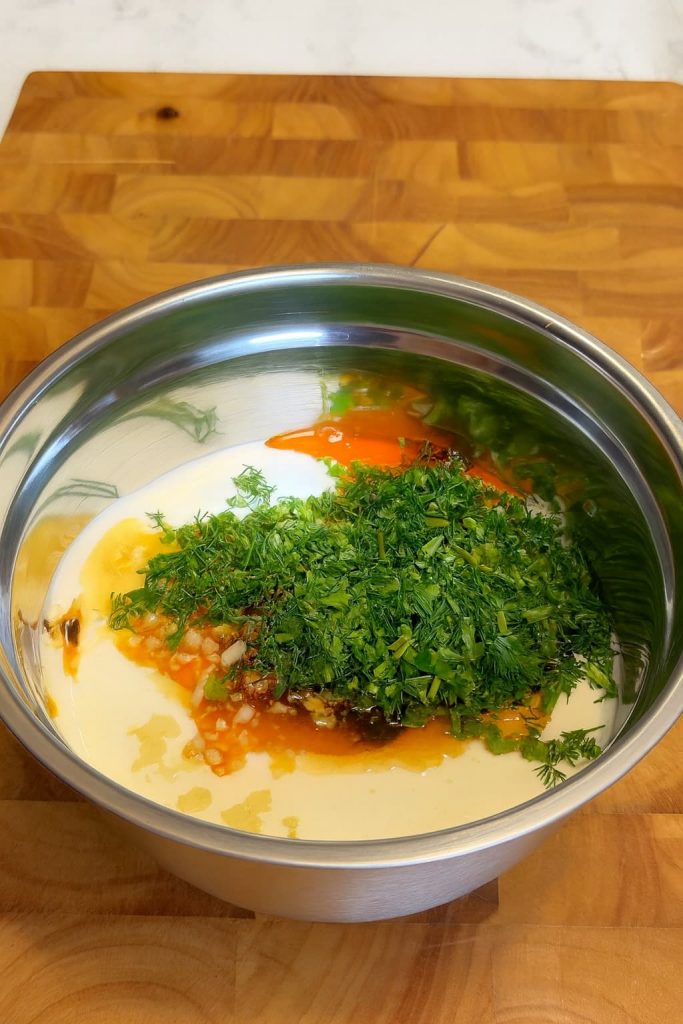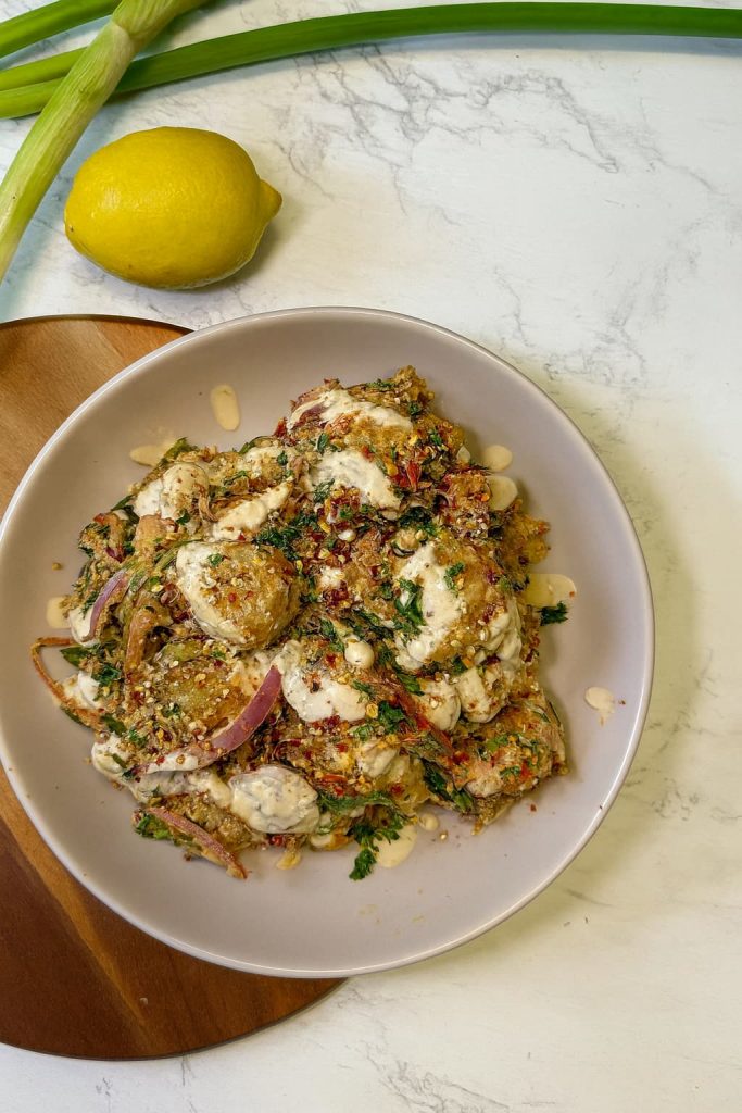 Preparar. el aderezo mezclando yogur vegano, tahini, aceite de chile, ajo, perejil y limón.