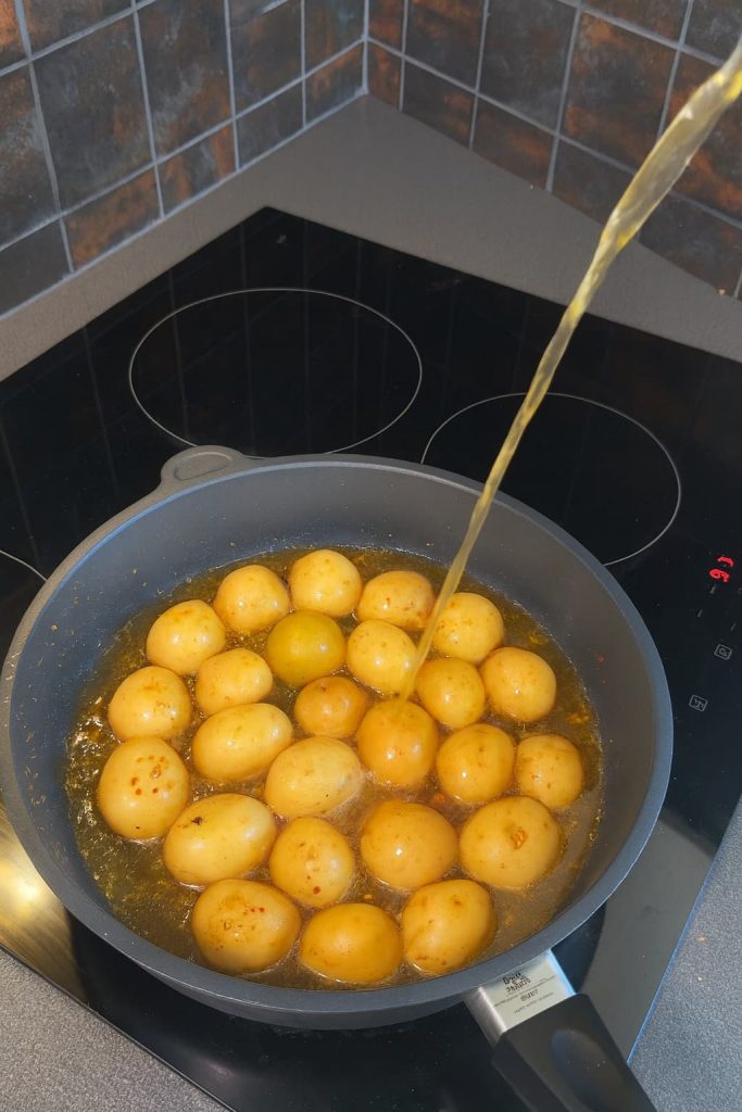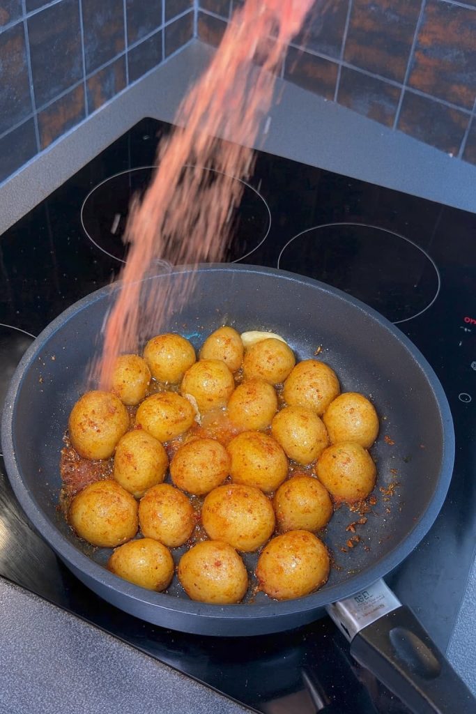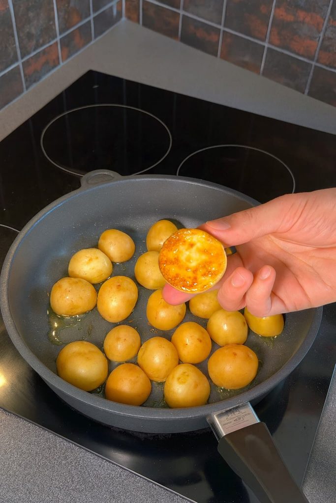 Dorar. las patatas baby cortadas por la mitad en una sartén con sal hasta que estén doradas.