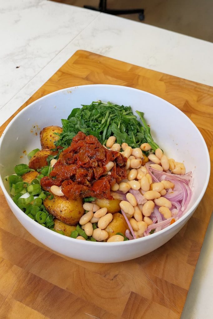 Esta ensalada cremosa de patatas combina tiernas patatas baby, rúcula fresca y picante, tomates secos al sol llenos de umami y alubias blancas ricas en proteína. Todo se une con un aderezo sedoso de tahini y yogur vegano, con un ligero toque de aceite de chile, perejil fresco y zumo de limón.