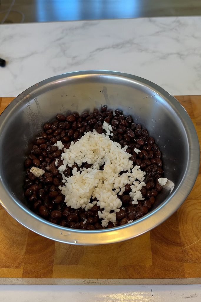 Machacar y mezclar. Seca bien las alubias y aplástalas junto al arroz. Añade cebolla salteada, salsa de soja, pasta de tomate, especias y pan rallado.