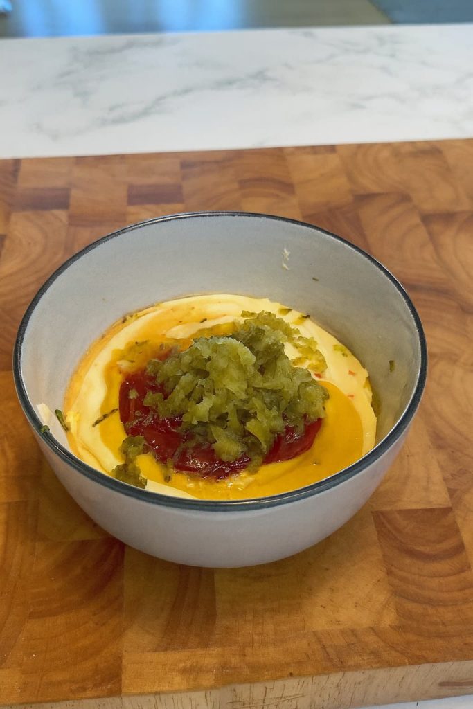 Preparar la salsa. Mezcla mayonesa, ketchup, pepinillos dulces picados, vinagre y un poco de azúcar.