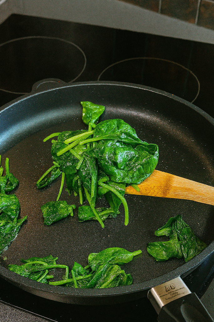 - Cocina las espinacas en la misma sartén con un poco de aceite hasta que se reduzcan ligeramente.
