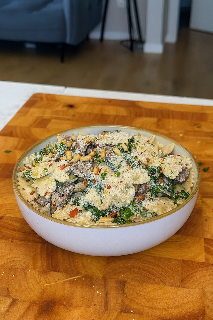 Una receta vegana reconfortante, perfecta para una cena rápida entre semana. Lleva champiñones llenos de sabor umami, espinacas nutritivas y una cremosa salsa de queso vegano. Todo preparado en menos de 30 minutos y en un solo bol.