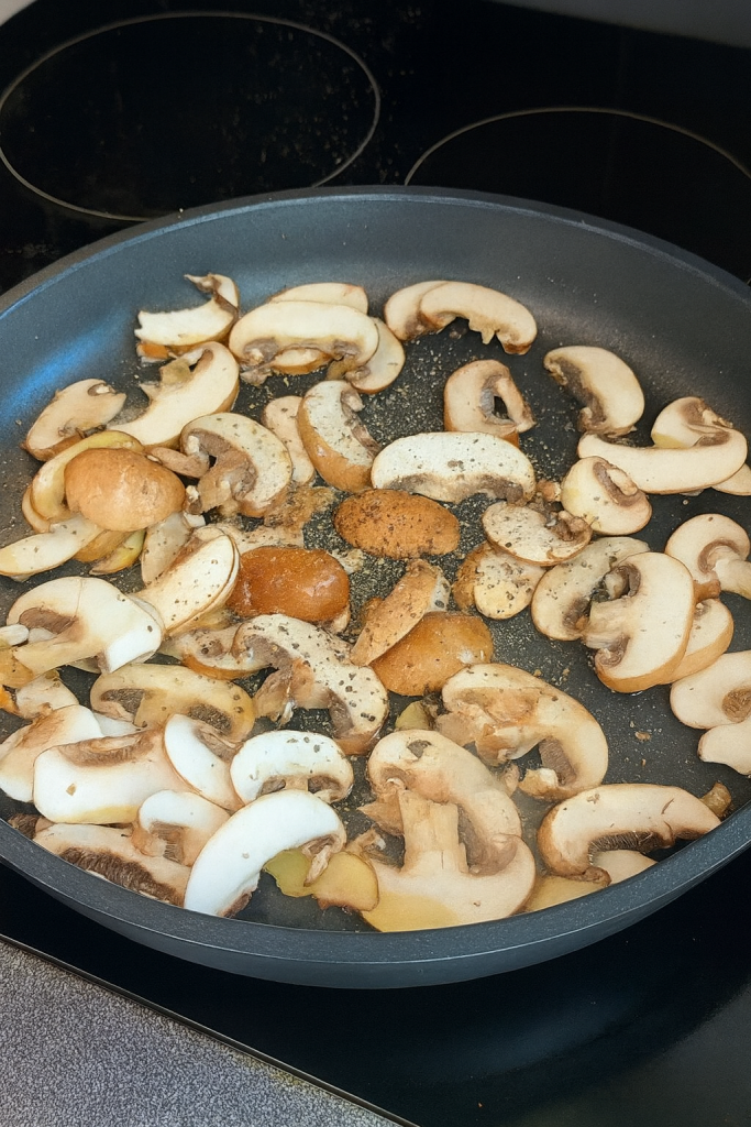 - Saltea los champiñones en mantequilla vegana y aceite de oliva hasta que estén dorados y tiernos. Añade chile rojo y pimienta.