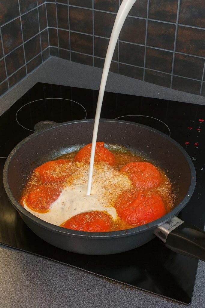 Sí. Usa tomates en lata enteros y escúrrelos ligeramente antes de cocinarlos.