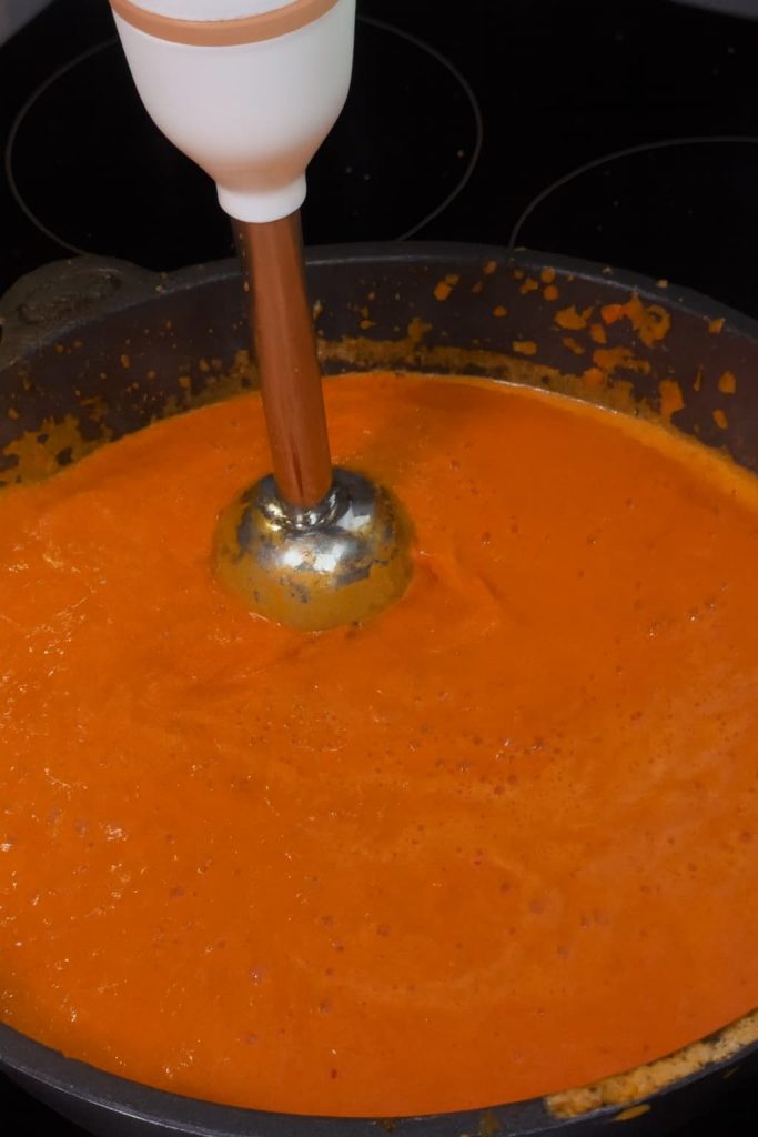 Añade pasta de tomate, especias, crema vegetal y agua. Tritura todo hasta obtener una salsa lisa.