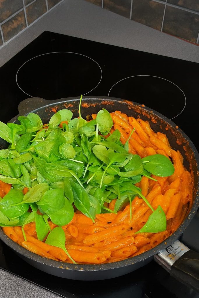 Incorpora la pasta, mezcla bien y añade espinacas y albahaca justo al final para que se mantengan frescas.