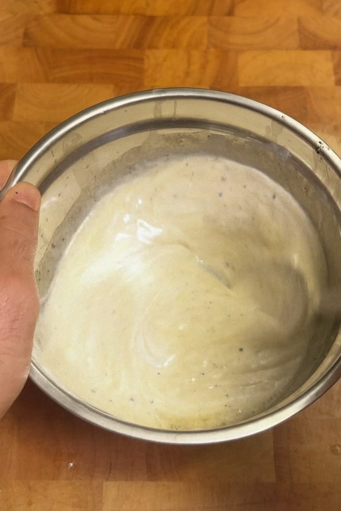 Haz la salsa. En un bol, bate tahini, yogur, zumo de limón, ajo rallado, aceite de oliva, mostaza, sal y un toque de agave. Añade un poco de agua si está demasiado espesa.