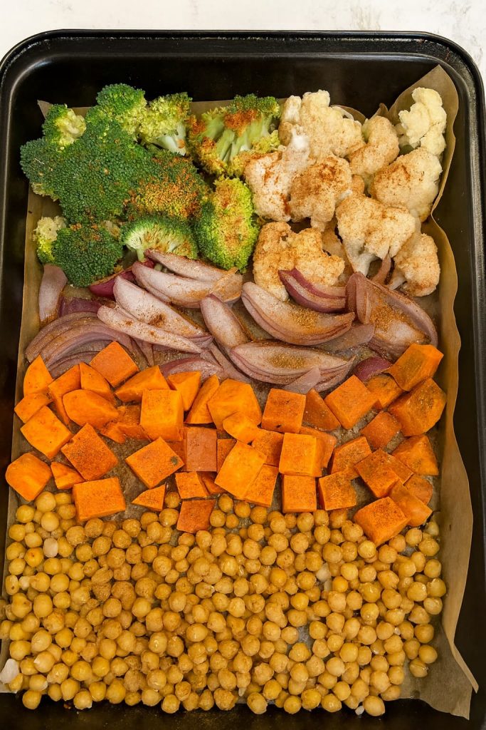 Prepara las verduras. Corta la batata en cubos, la cebolla en gajos y separa los ramilletes de brócoli y coliflor. Añade los garbanzos escurridos. Mezcla con aceite de oliva, sal, pimienta, pimentón y comino. Extiende en una bandeja amplia sin amontonarlas. Hornea a 200 °C durante 25–30 minutos, removiendo a mitad del tiempo.