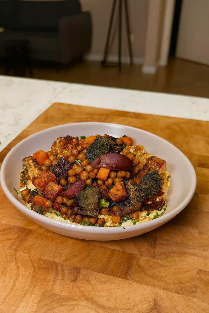 No hay nada más reconfortante que sacar del horno una bandeja repleta de verduras asadas, caramelizadas y llenas de sabor. En esta receta, la dulzura natural de la batata, el toque crujiente de los garbanzos y la intensidad del brócoli y la coliflor se realzan con especias y un chorrito de aceite de oliva. El verdadero protagonista, sin embargo, es la salsa cremosa de tahini y yogur, que aporta un equilibrio perfecto de acidez, suavidad y notas de frutos secos.